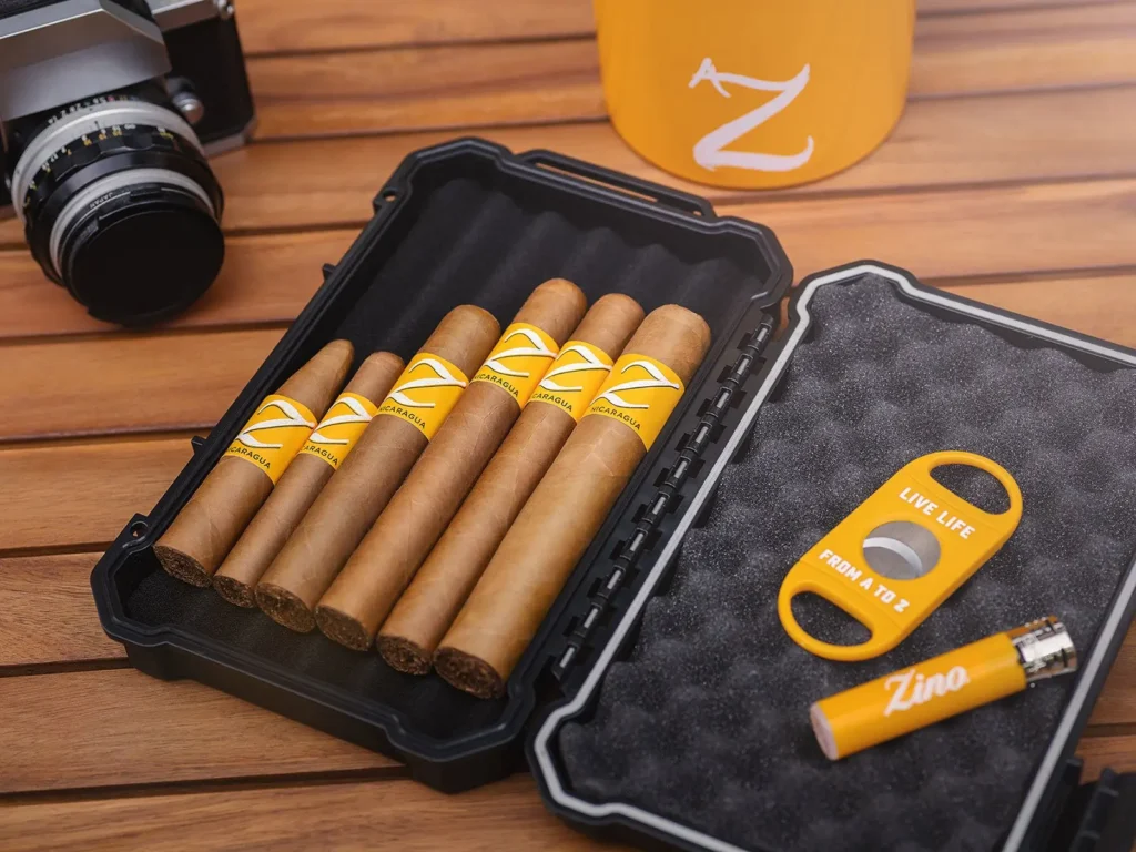 The Zino Nicaragua Short Torpedo offers distinctive aromas of fresh pepper, salted nuts and dark chocolate. Its horizon-broadening blend brings a distinguished Nicaraguan spiciness, combined with the creaminess of Dominican tobaccos in a short enjoyment time. Ideal for novices or occasional cigar aficionados.